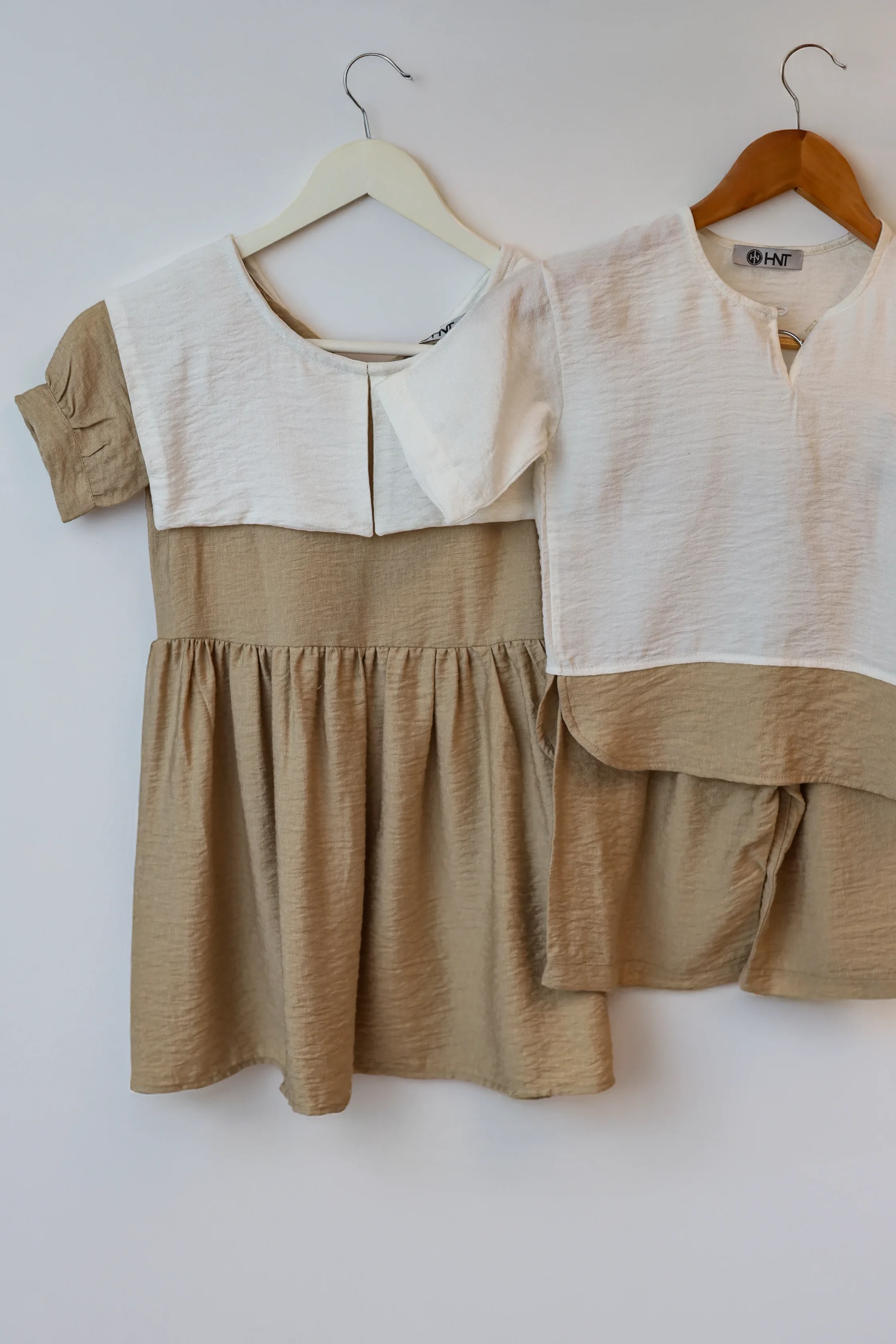 Raffiniertes 2-in-1 Kleid aus 95% Baumwolle und 5% Elasthan. Mit abnehmbarem Oberteil, das als separate Bluse getragen werden kann. Erhältlich in elegantem Beige mit Kontrastdetails. Maximale Vielseitigkeit bei minimalen Platzbedarf.