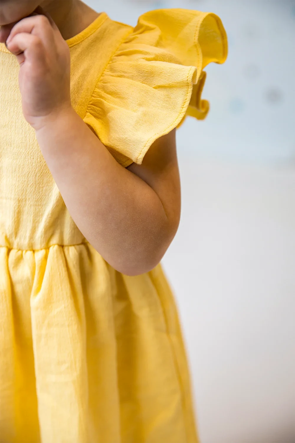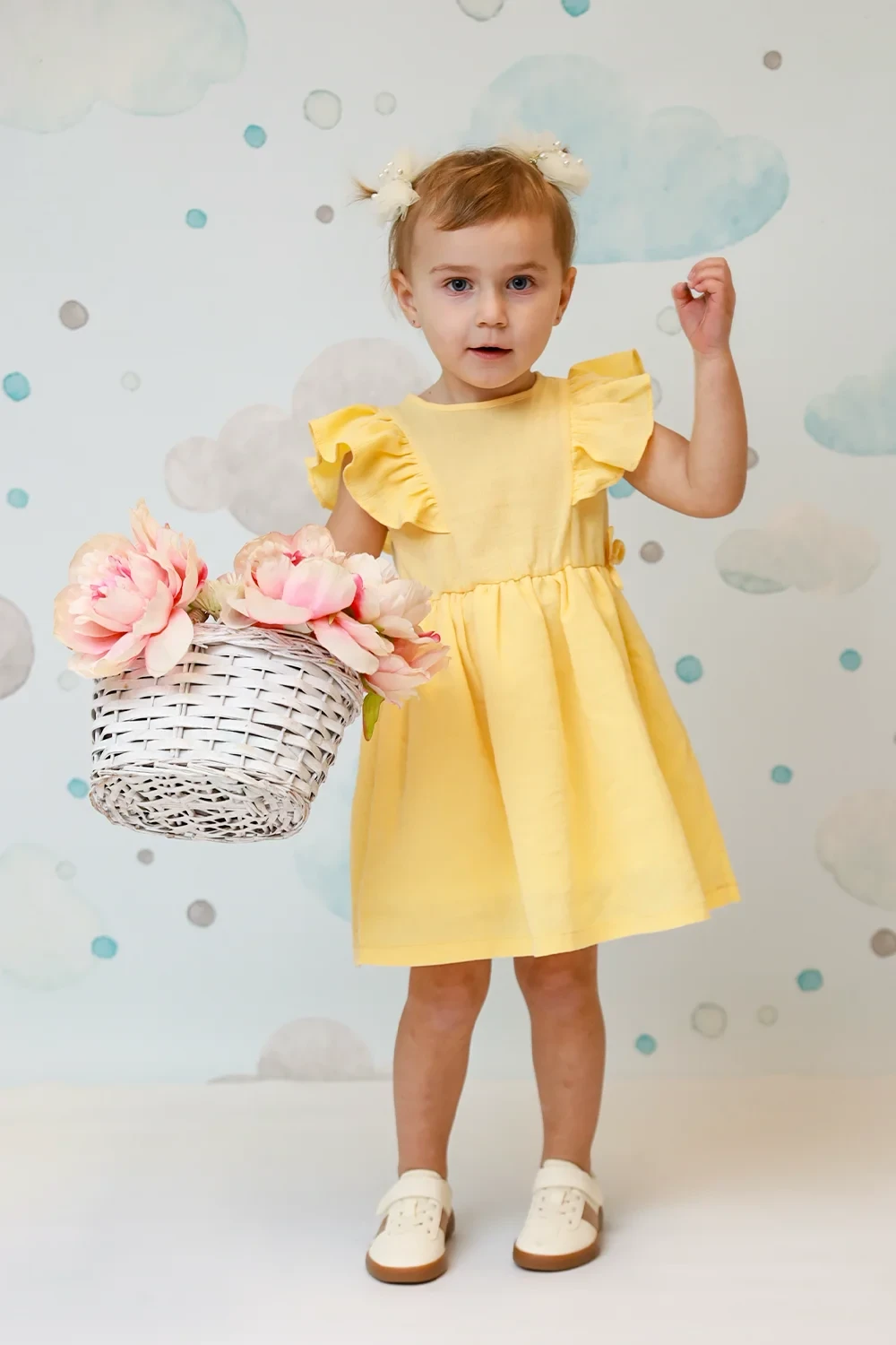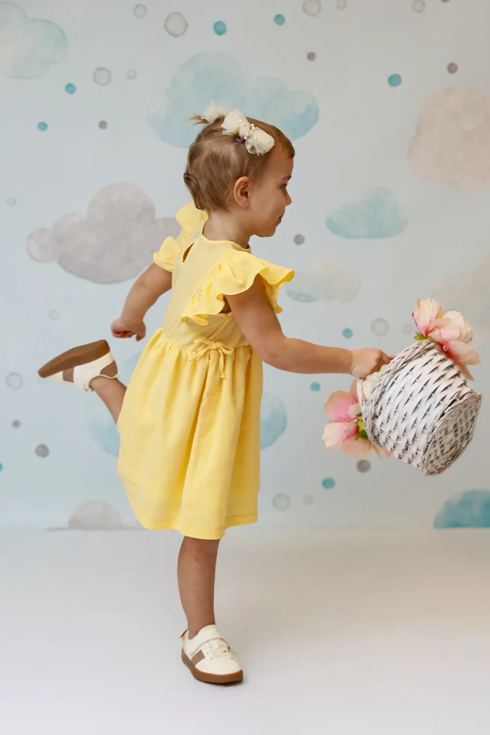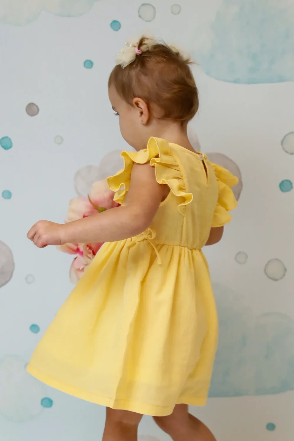Süßes Kleid mit Rüschendetails aus 95% Baumwolle und 5% Elasthan. Mit femininen Rüschenakzenten in Weiß, Rosa und Gelb. Perfekte Balance zwischen süß und elegant für junge Modefans.