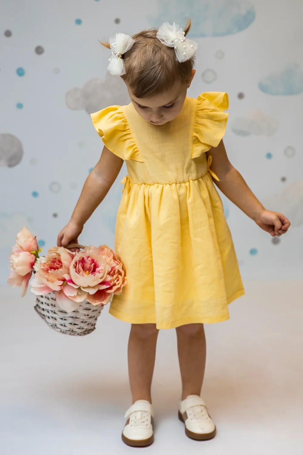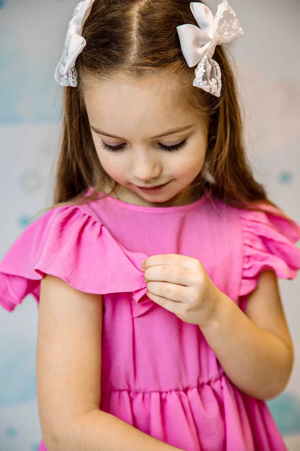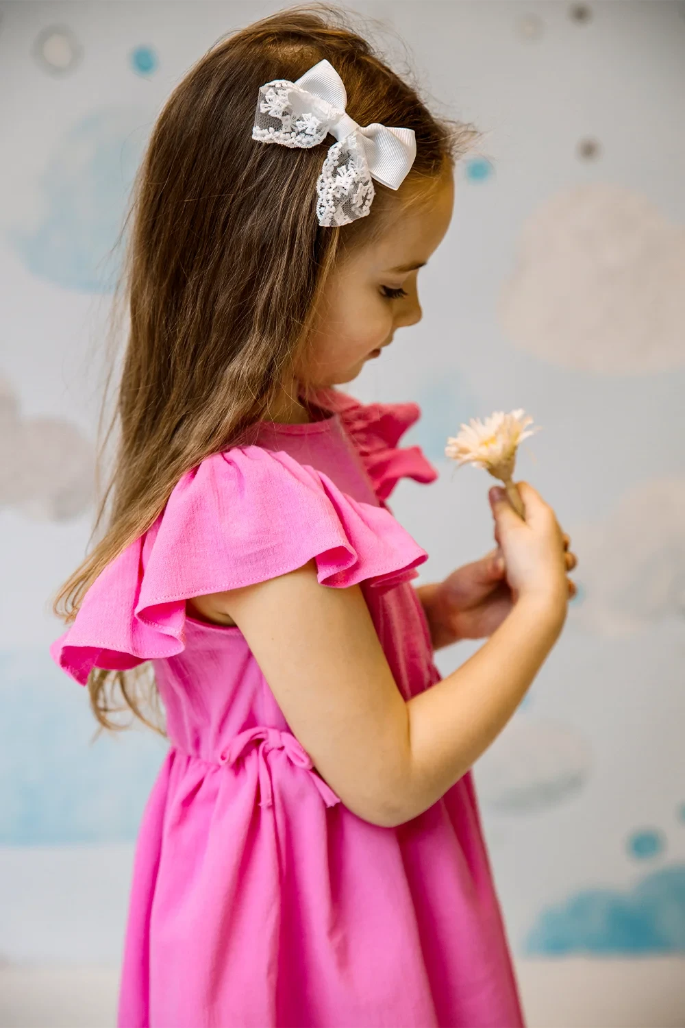 Süßes Kleid mit Rüschendetails aus 95% Baumwolle und 5% Elasthan. Mit femininen Rüschenakzenten in Weiß, Rosa und Gelb. Perfekte Balance zwischen süß und elegant für junge Modefans.